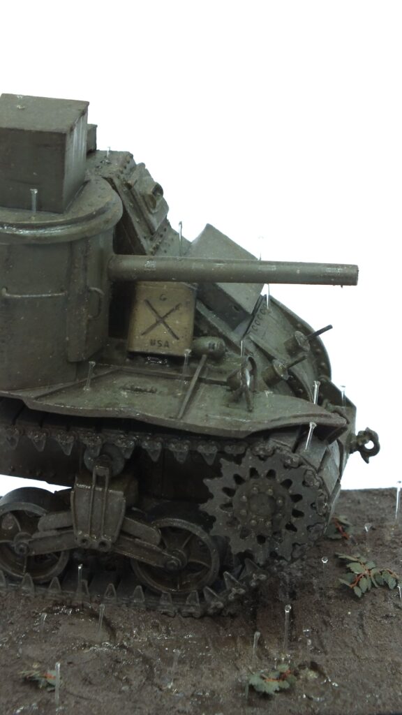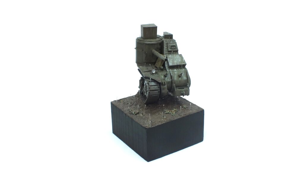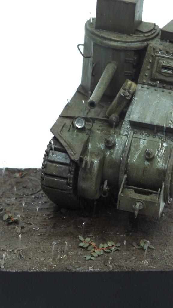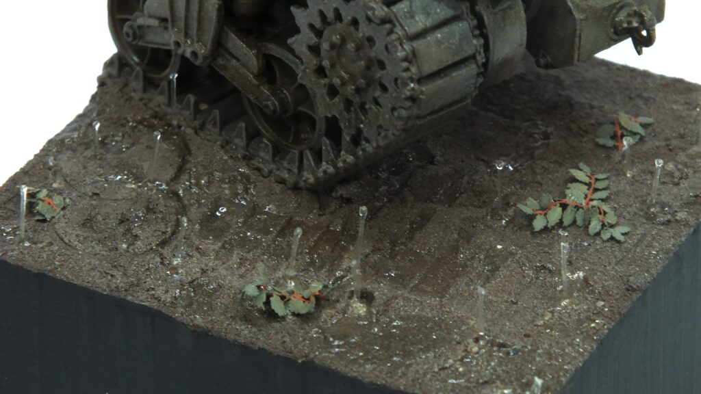 For the active rain drops I cut thin and short pieces of nylon wire to lenght. They are stable enough to stand up on their own when fixed with super glue but flexible enough to not break immediatly. Afterwards I added rather thick effect paint to both the top and bottom of the rain drops. This gave the illusion of them bouncing back up from the ground or tank. To be honest, I am really happy with how it turned out and it actually wasn’t a lot of work at all in the end. Just some patience and calm hands.