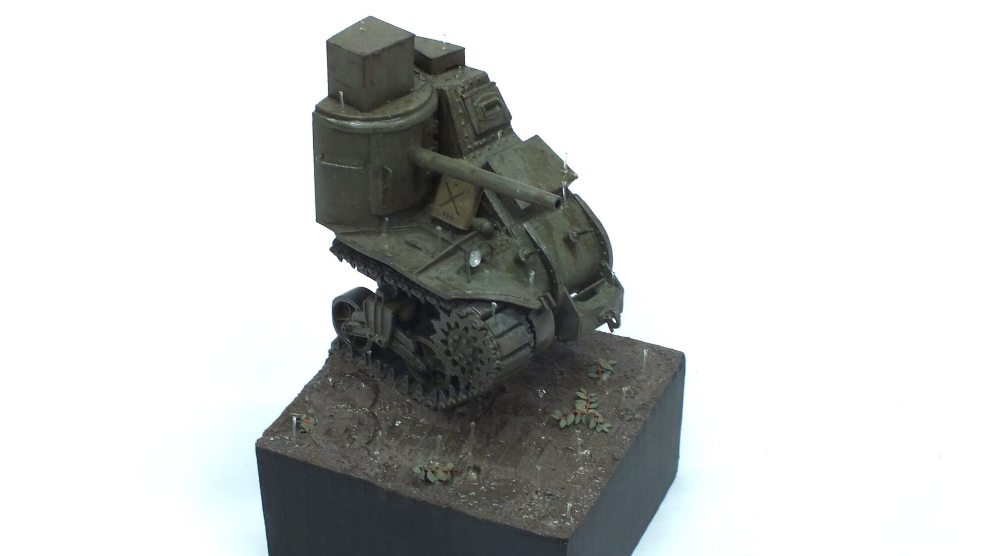 For the base I turned to my trusty section of cut-off pieces. Turns out a fitting piece was actually just waiting for me. I just sanded it down and added some really simple earth-effects using texture putty. I created some marks from oil/fuel barrels as well as some tires marks, but thats about it. It was hard to decide wether a figure would be a good idea, however my laziness ruled over me and I am not mad at all looking at the final piece.